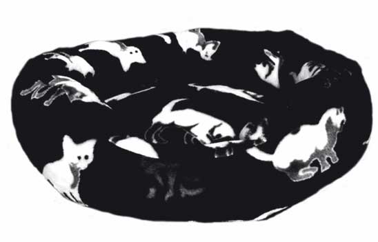 A 50cm nest bed in black with cat motif with polyester fleece padding and polyester fleece filling. Washable by hand up to 30 °C